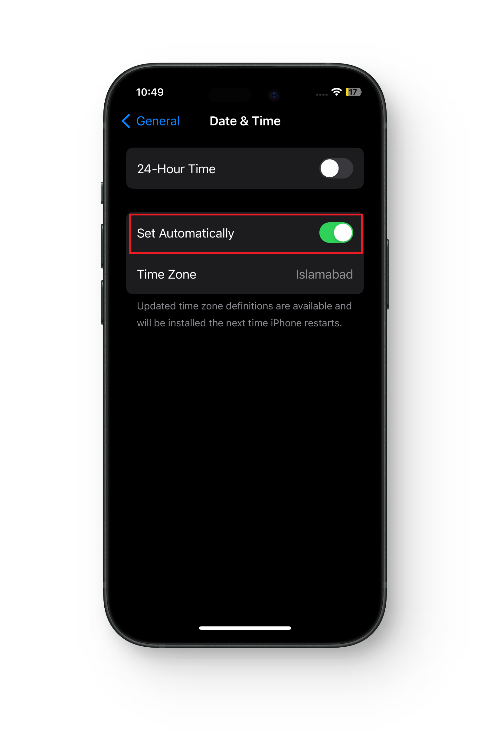 - ابحث عن الخيار المسمى “تعيين الوقت والتاريخ تلقائيًا” وتأكد من تفعيل المفتاح الخاص به.