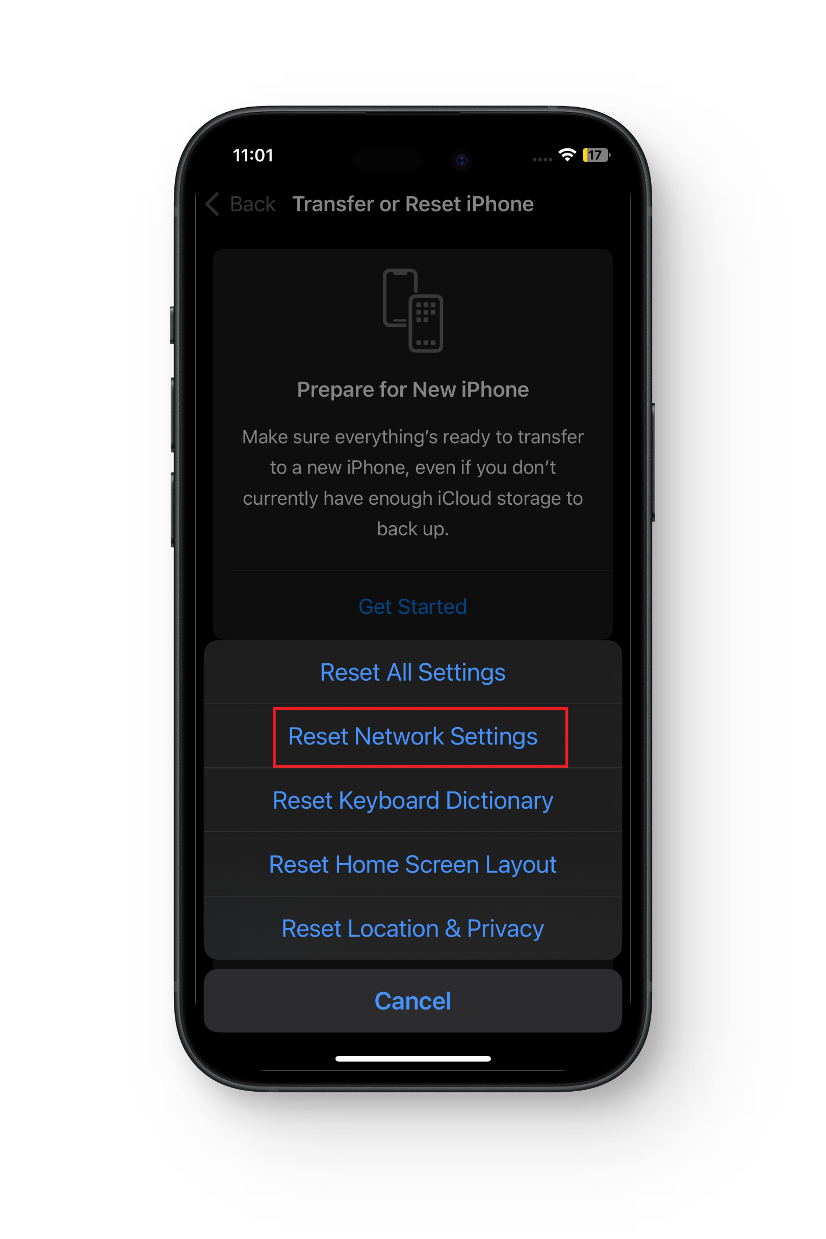 - اختر “إعادة تعيين إعدادات الشبكة”. قم بالتأكيد إذا طُلب منك ذلك. سيعاد تشغيل جهازك لتطبيق التغييرات.