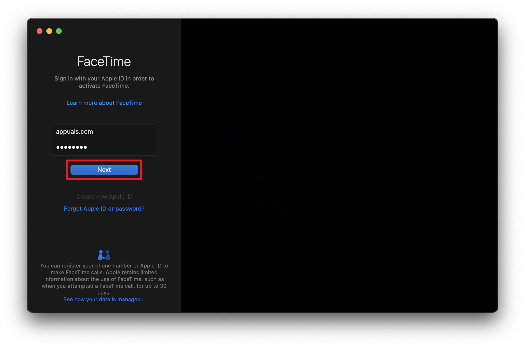 - افتح تطبيق FaceTime على جهاز Mac الخاص بك وأدخل Apple ID وكلمة المرور الخاصين بك في الحقل المخصص.