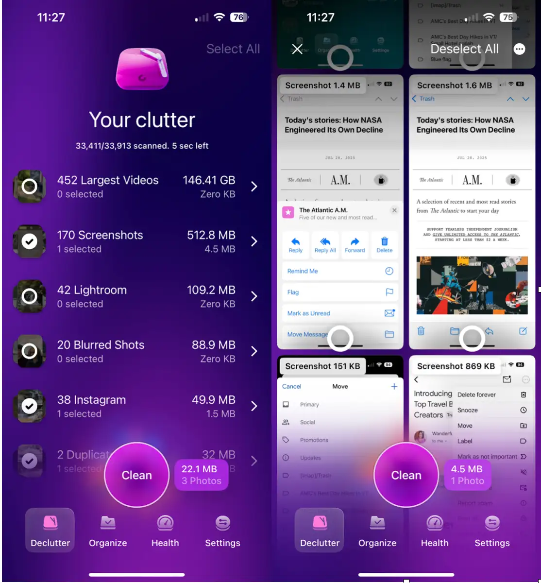 نصيحة احترافية: بدلاً من حذف الملفات الكبيرة يدويًا، استخدم وحدة “Declutter” في تطبيق CleanMy®Phone. يقوم هذا التطبيق بفحص جهازك بسرعة بحثًا عن مقاطع الفيديو الكبيرة والصور المكررة ولقطات الشاشة القديمة، مما يتيح لك تحرير مساحة كبيرة (جيجابايت) حتى يعمل كل شيء بشكل أسرع. هذا لا يحل مشكلة “عدم تحميل” سعة التخزين فحسب، بل يحسن أيضًا الأداء العام للجهاز بشكل ملحوظ. بالإضافة إلى ذلك، يمكن للتطبيق تحديد الملفات المؤقتة والبيانات غير الضرورية التي غالبًا ما تتسبب في بطء iPhone.