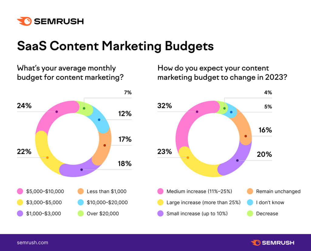وفقًا لبيانات SEMrush، تُخصص شركات SaaS ميزانيات كبيرة لتسويق المحتوى، حيث ينفق 24% منها ما بين 5,000 و10,000 دولار شهريًا، ويستثمر 18% أخرى ما بين 10,000 و20,000 دولار.