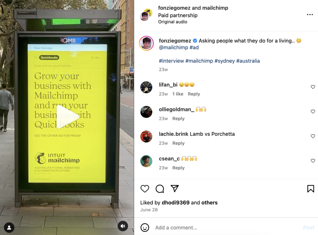 2. الشراكة مع المؤثرين. جلبت الشراكة مع Fonzie Gomez مصداقيةً ووسعت نطاق وصول الحملة إلى جمهوره، والذين يُرجح أن يكون العديد منهم رواد أعمال أو مستقلين – وهو الجمهور المثالي لـ Mailchimp.